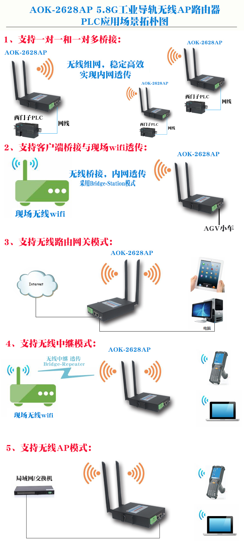 主要应用于工业工控智能领域,PLC工业通信应用、AGV导航车(客户端主动漫游)、风电场风机通信、搬运机器人、矿用通迅覆盖,自动化互联,机器人等。