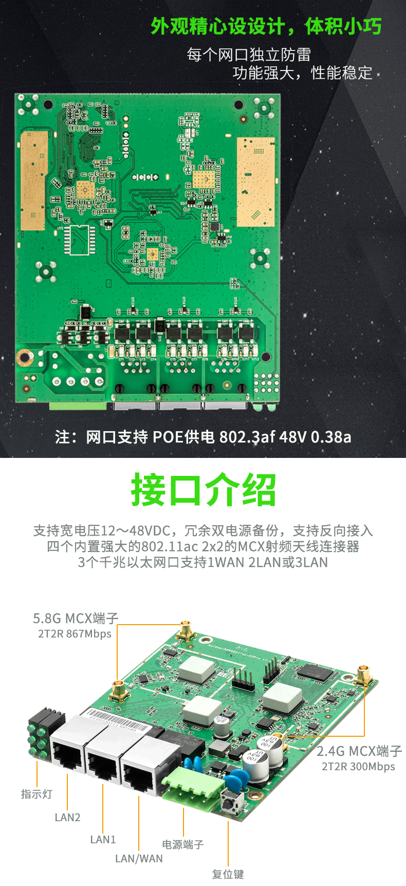 供电 POE 802.3af 48v 0.38a , DC 12~48VDC 支持冗余双备份电源,支持反向接入。