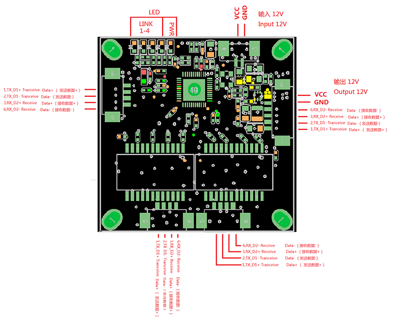 符合IEEE 802.3、IEEE 802.3u、IEEE 802.3ab标准;全双工采用IEEE 802.3x标准,半双工采用Backpressure标准;4个10/100M自适应插针网口,支持端口自动翻转(Auto MDI/MDIX)每个端口支持自动协商功能,自动调整传输方式和传输速率;支持MAC地址自学习;支持全速转发无阻塞通信迷你尺寸设计,38X38MM(长X宽)动态LED指示灯,提供简单的工作状态提示及故障排除;电源支持9-12V输入