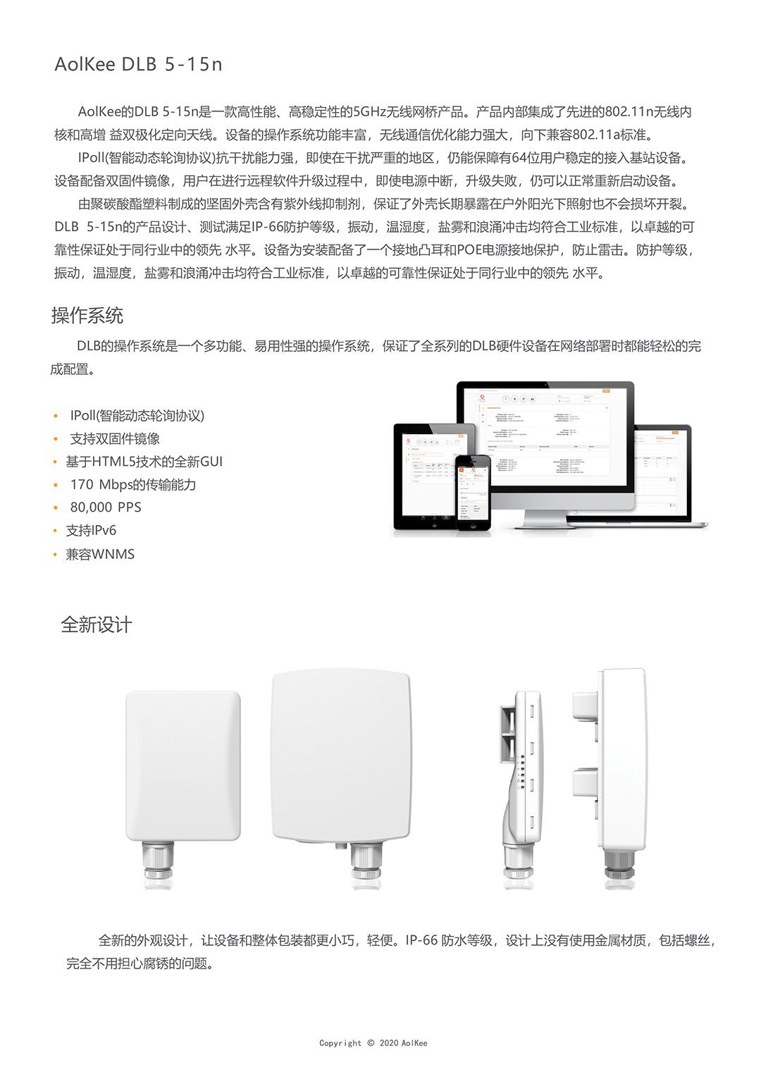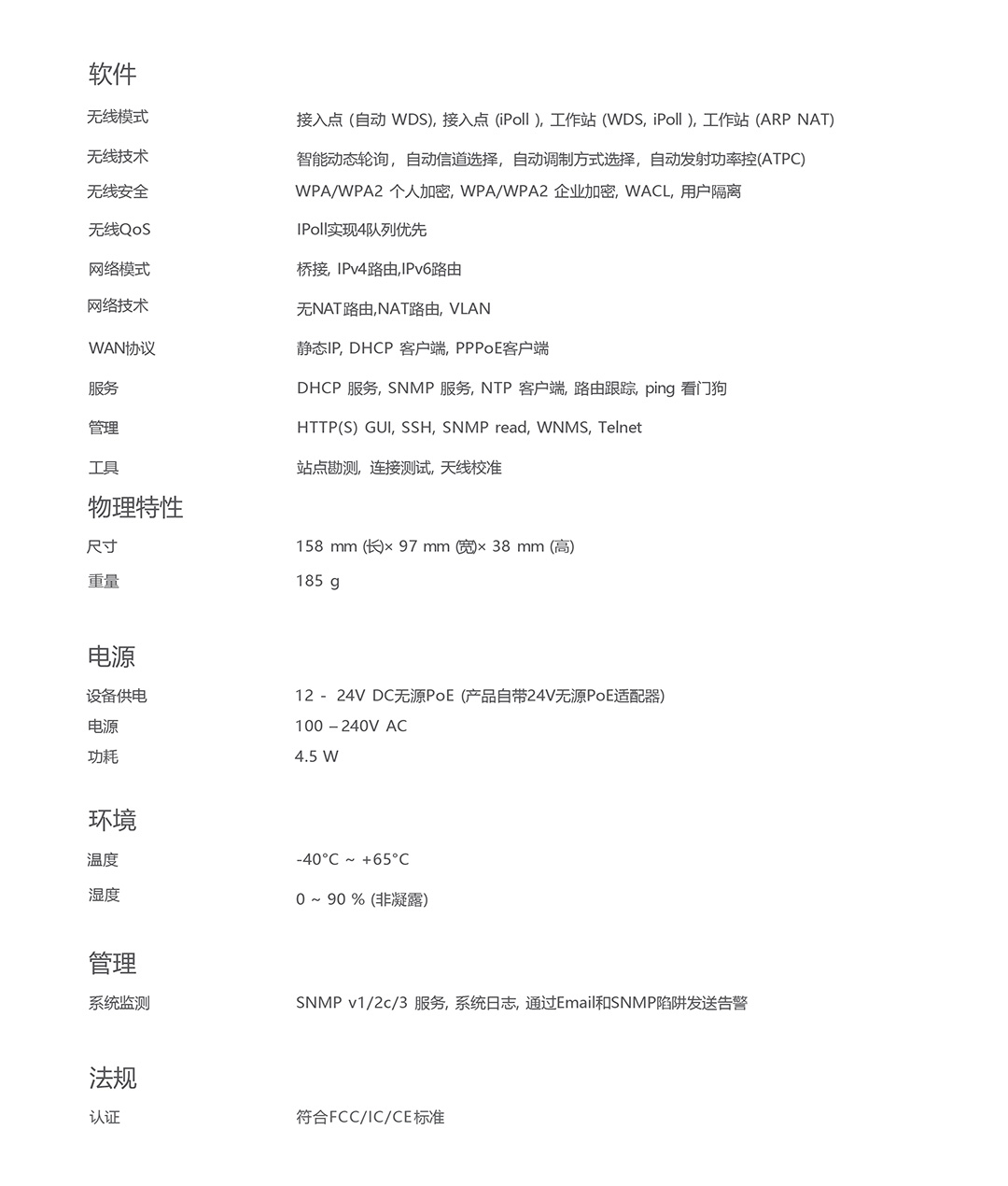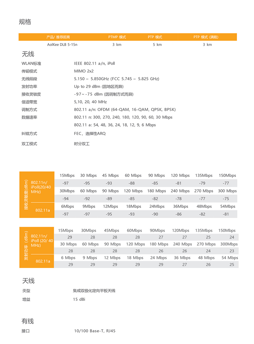 符合IEEE 802.11a/n 标准协议,频率5180~5785MHz支持扩频 。