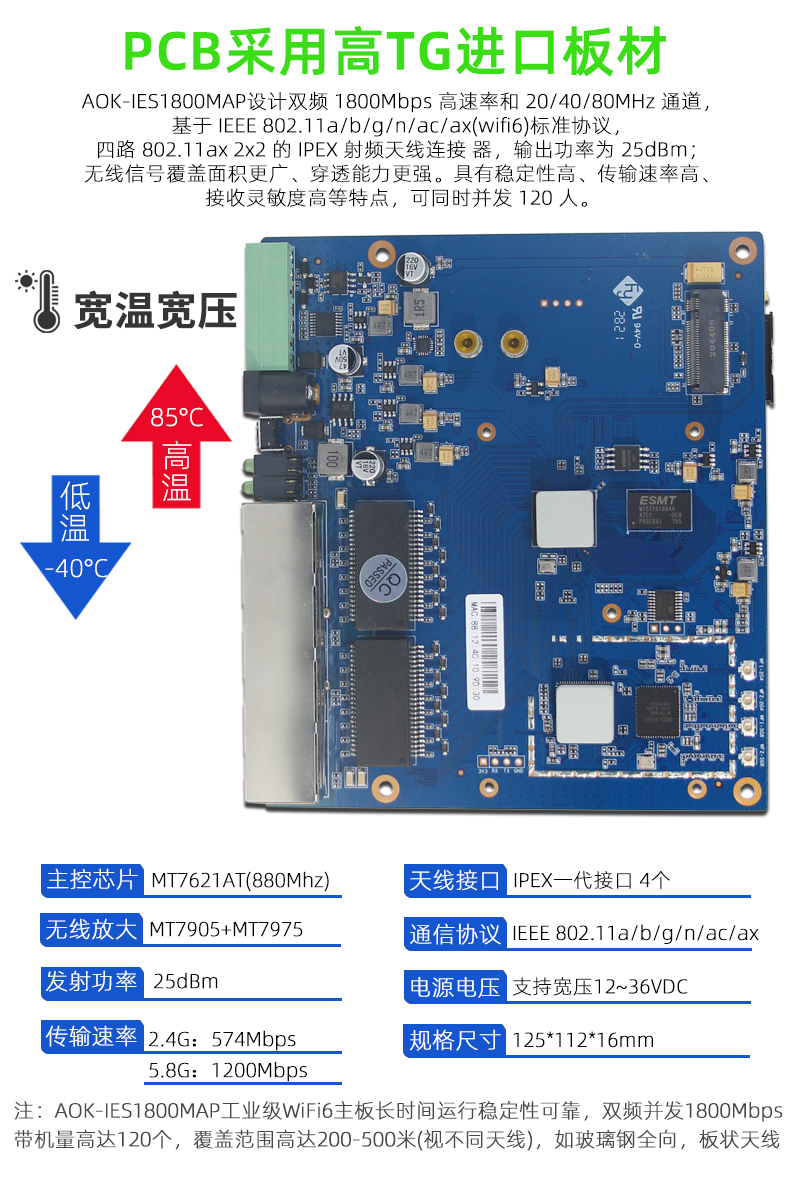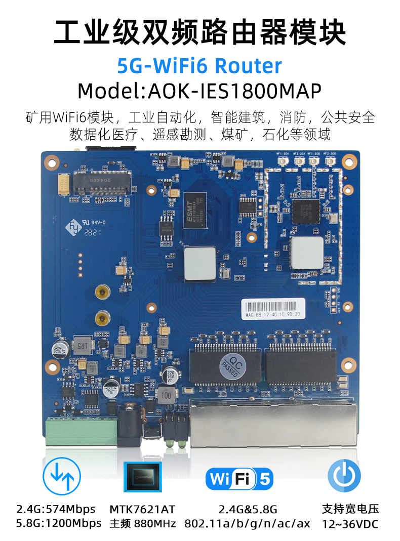 符合 IEEE 802.11a/b/g/n/ac/ax(wifi6)标准; 无线传输速率最高可达 1800M ; 4 个千兆 LAN/WAN,均支持自动协商和端口自动翻转; 发射功率达到 25dBm; 支持 AP 发射,路由中继功能,轻松扩展无线网络; 支持 5G NR-NA/NSA 高速网络和 4G 高速网全网通,(默认不带 5G 模块,客户可另选购); 支持 PPPoE、动态 IP、静态 IP 等宽带接入方式; 支持多种 VPN 功能 ; 提供 64/128/152 位加密,支持/WPA/WPA-PSK、WPA2/WPA2-PSK 安全机制; 内建 DHCP 服务器,可自动、动态分配 IP 地址; 支持端口映射,DMZ 以及 DTU 功能; 全中文配置界面,支持免费软件升级。