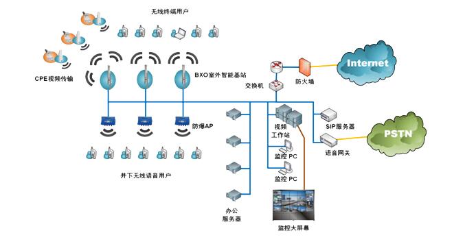 主要用于语音电话调度应用,把国信通无线模块组合而成防爆无线AP,部署在井下矿道、矿洞内,实现无线覆盖, 满足无线语音电话通信的需要。防爆无线AP之间,可以通过传输线路相互组网,也可以通过无线链路灵活的相互组 网。