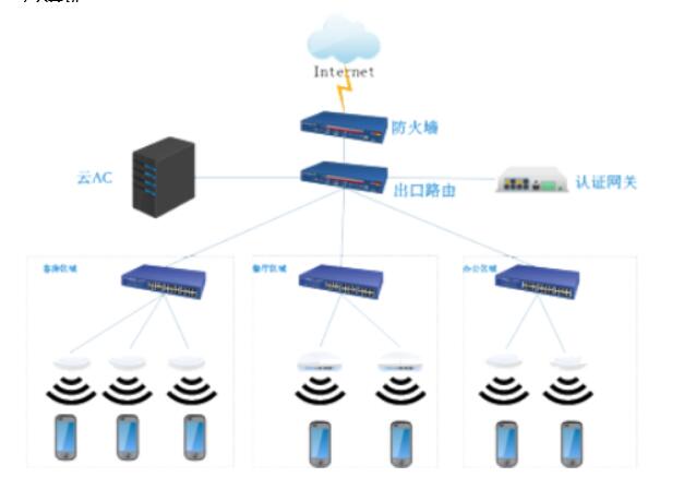 结合用户无线网络需求情况和无线产品自身技术特点,为了满足用户构建一一个高速、稳定、安全、可靠易于管理的无线接入网络的需求,本设计方案按照AP +云AC/硬AC+上网行为管理的结构化无线网络解决方案进行设计。整体框架基于瘦AP方式部署,采用AC对AP进行集中管理、控制,以及对接入终端的认证、数据分布式/集中式转发、 漫游等功能,操作和维护工作现在只需要在AC上进行就可以了。